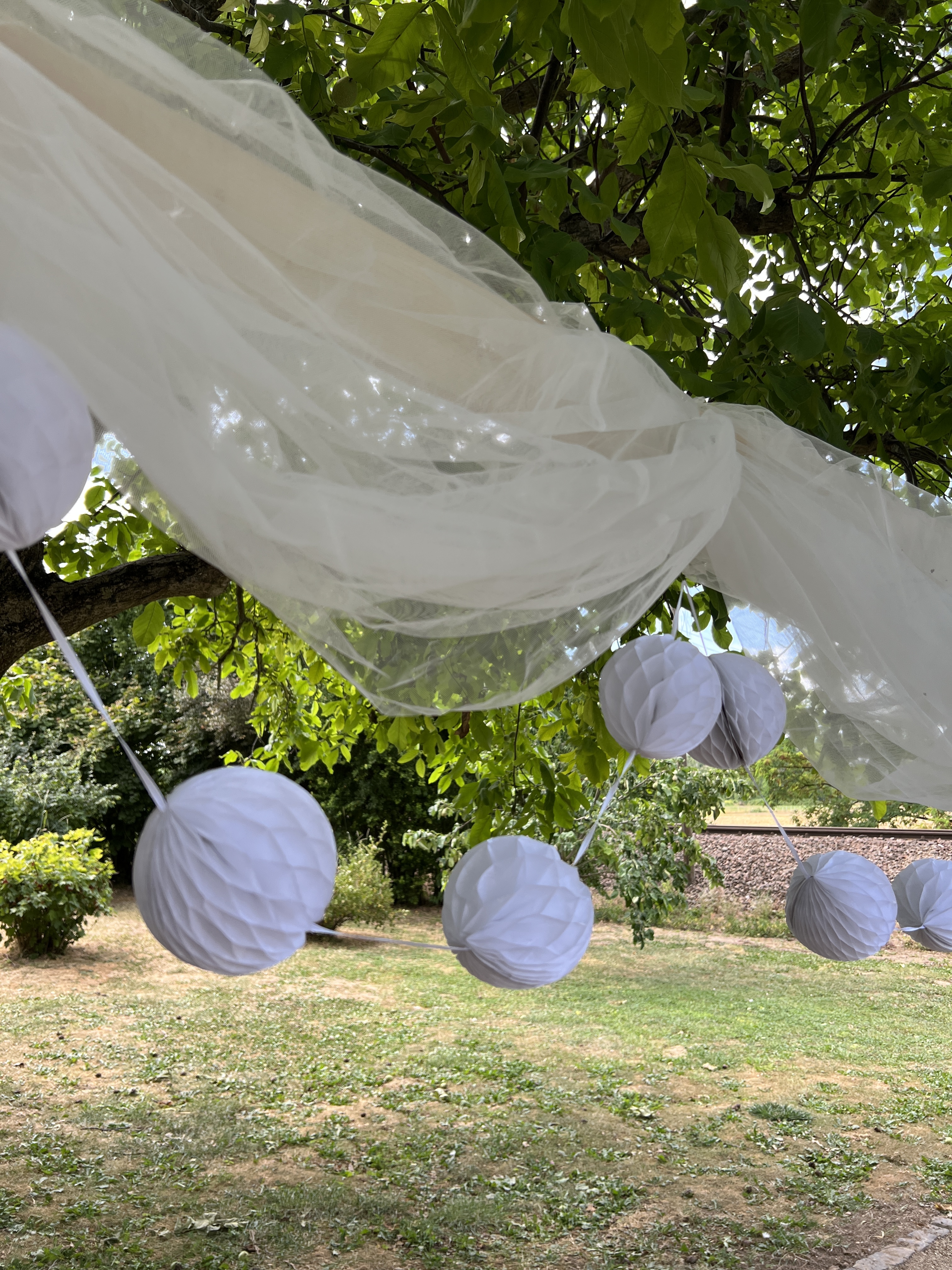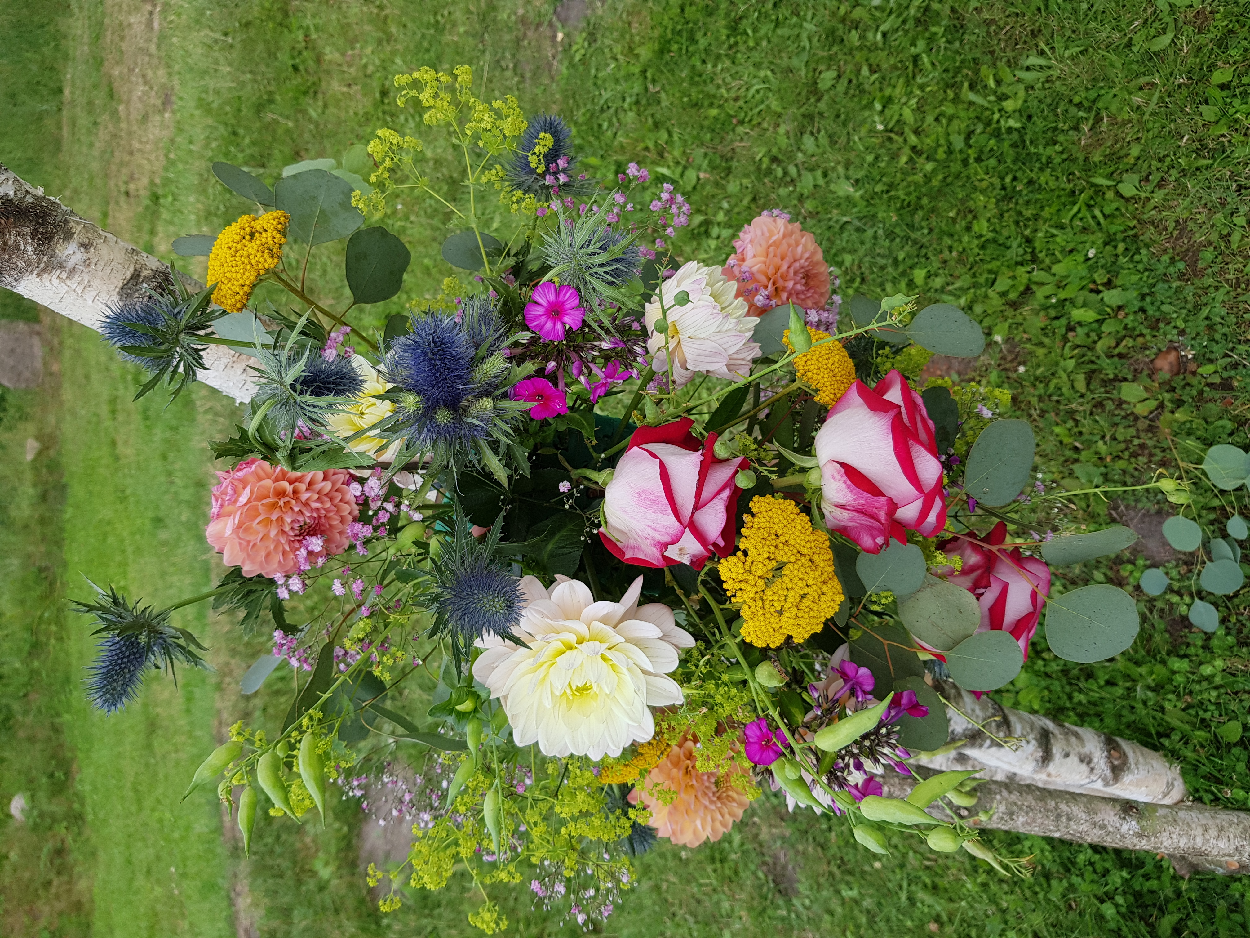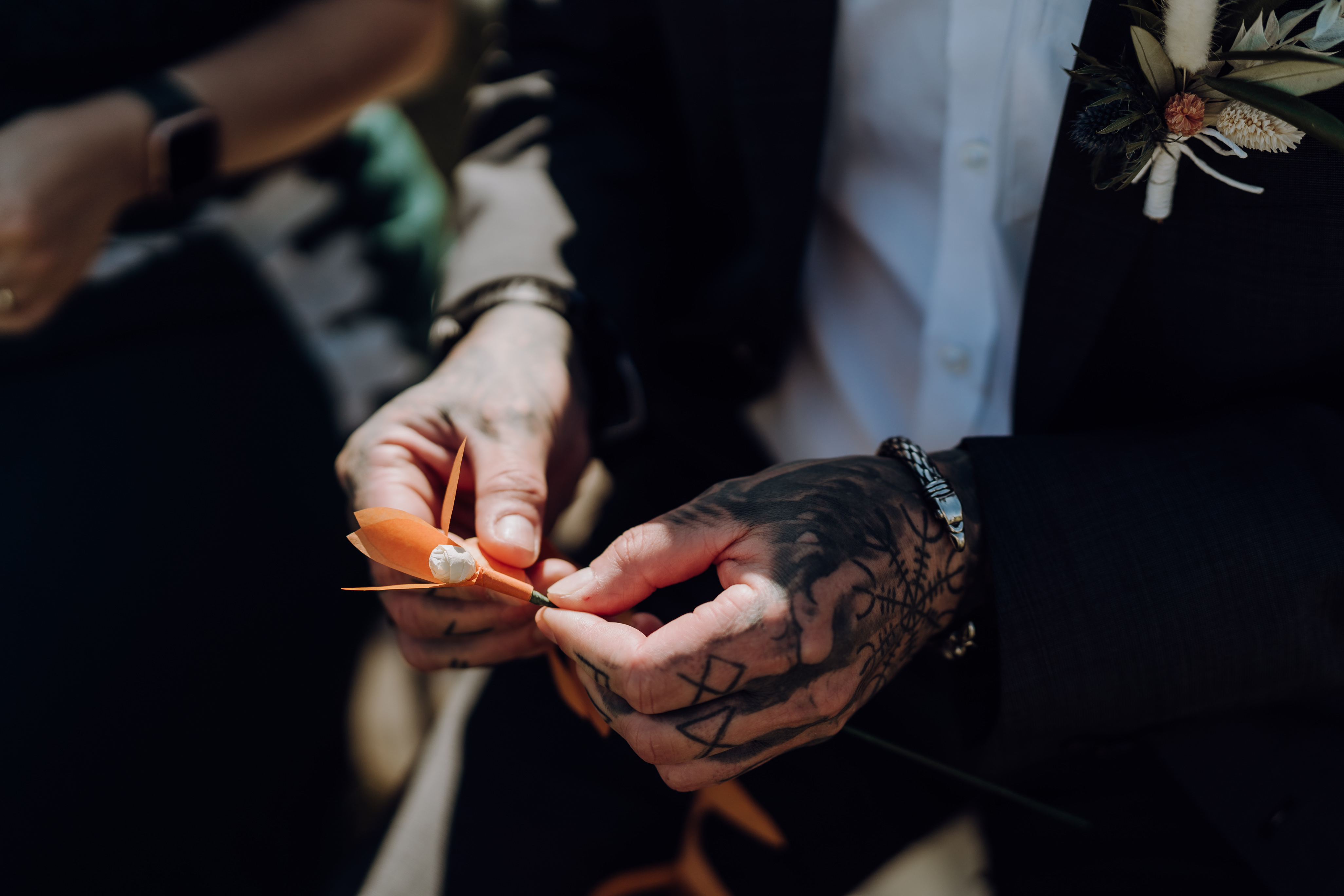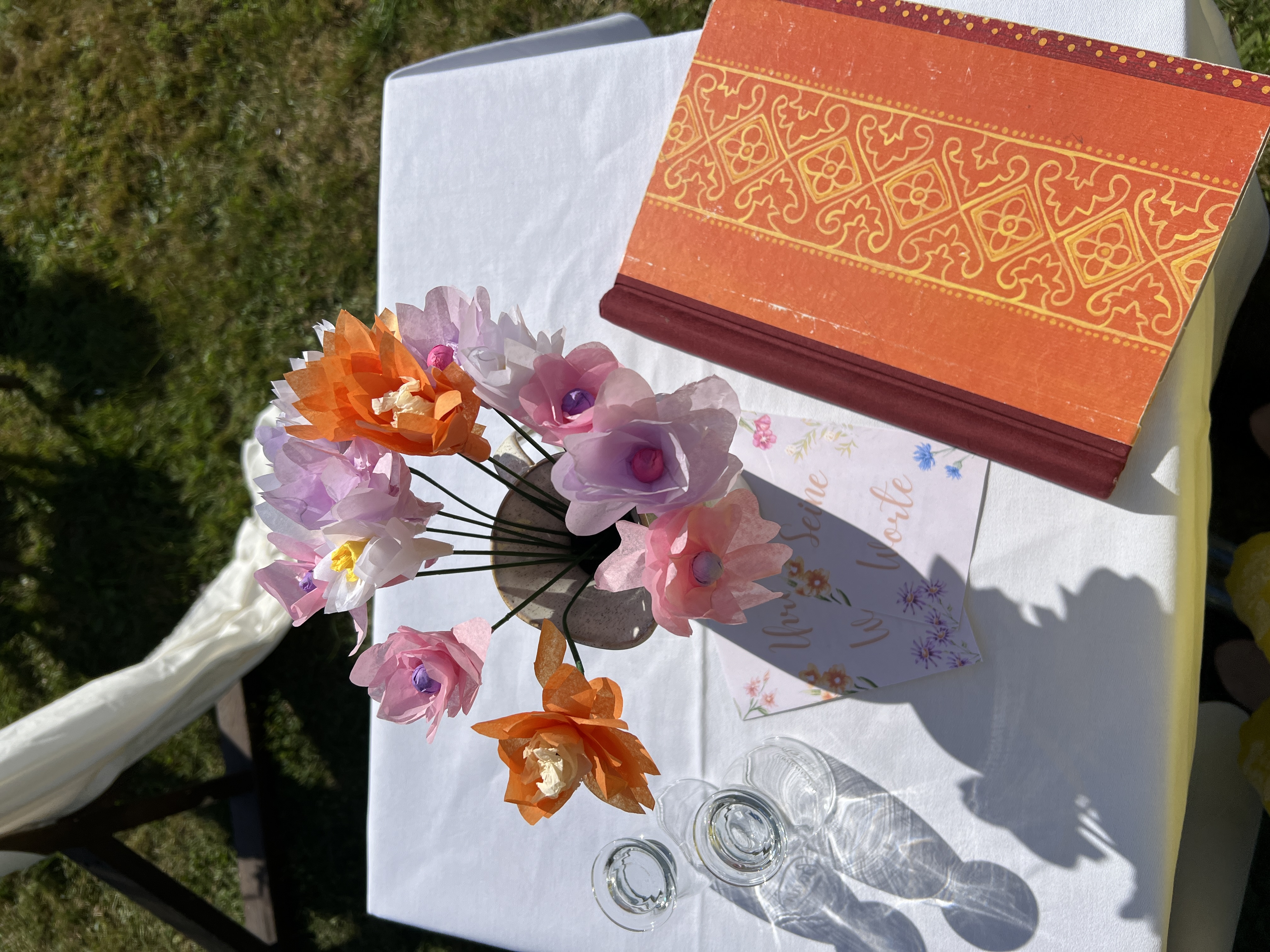Ein Bräutigam beeindruckte seine Frau bei den ersten Dates mit selbstgebastelten Dingen, darunter eine Blume mit den Worten: „Diese hier verwelkt nicht.“ Im Ritual bastelten alle gemeinsam Seidenpapierblumen – jede:r eine – und am Ende entstand ein wunderschöner Strauß.