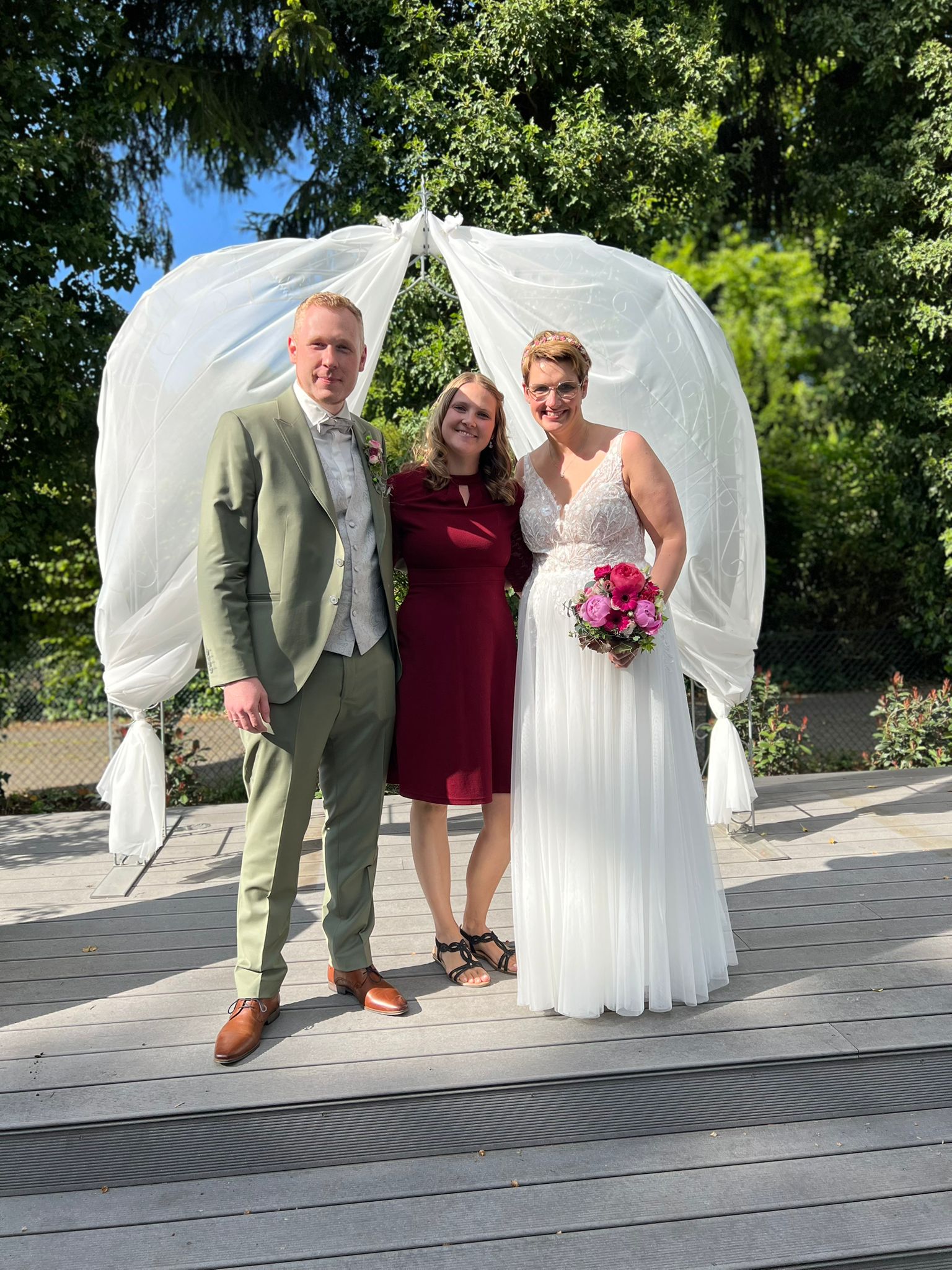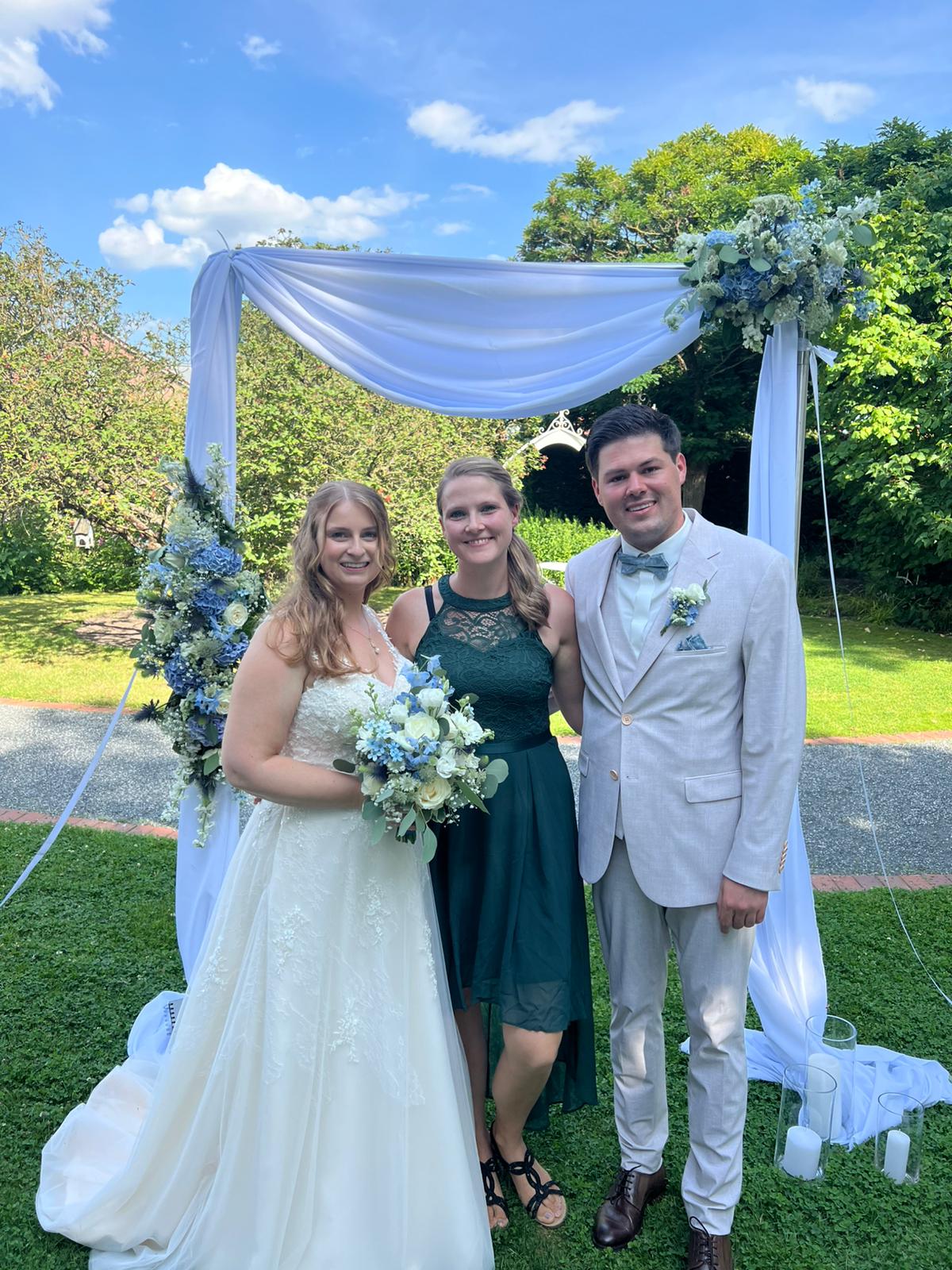 Unsere freie Trauung wurde von Patricia im Sommer durchgeführt. Fast anderthalb Jahre nach unserer freien Trauung haben wir nun die Zeit gefunden, ein paar Worte dazu zu schreiben. Sehr gerne denken wir an den schönsten Tag in unserem Leben zurück. Ein Tag mit perfektem Wetter, voller Emotionen, Tränen - ob vor Freude oder vor Rührung. Wir sind sehr glücklich darüber, Patricia als unsere Traurednerin ausgewählt zu haben. Nach einem ersten persönlichen Kennenlernen war uns schnell klar, dass Sie die perfekte Person dafür ist. Wir danken ihr herzlich für die Begleitung vor, während und auch nach der Hochzeit, auch mit ganz persönlichem Interesse. Sie hat unsere Hochzeit mit Ihren Ideen für Rituale, Abläufe und Ansprachen einen wunderschönen und bezaubernden Glanz verliehen und damit auch bleibenden Eindruck bei all unseren Gästen hinterlassen. Auch dafür danken wir Ihr ganz herzlich und wünschen Ihr alles, alles Liebe für Ihre Zukunft. Ganz liebe Grüße