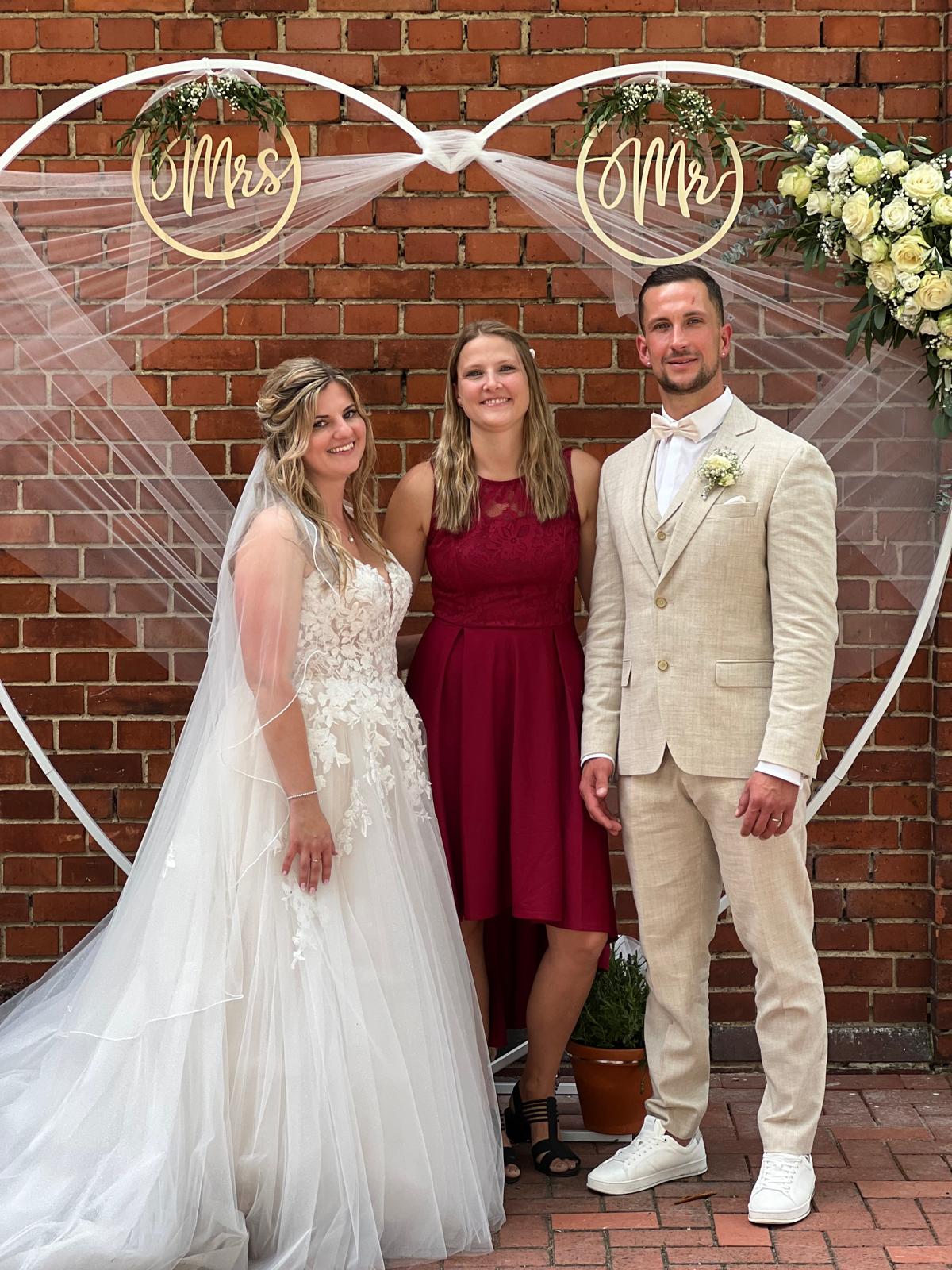 Liebe Patricia, wir möchten uns von Herzen bei dir für deine wundervolle Begleitung auf unserem Weg zur Hochzeit bedanken! Bereits vor einem Jahr haben wir dich kennengelernt und von diesem Moment an hast du uns mit so viel Herzlichkeit und Engagement unterstützt. Du warst stets erreichbar und hast dich um jeden unserer Wünsche gekümmert. Deine liebevolle Art und die Zeit, die du dir genommen hast, um mit uns über unsere Vorstellungen, unser Kennenlernen und unsere Geschichte zu sprechen, haben uns sehr berührt. Du hast sogar einen Blick auf unsere Eheversprechen geworfen und uns mit Rat und Tat zur Seite gestanden. Am Tag der Hochzeit selbst hast du nicht nur die freie Trauung mit so viel Gefühl und Wärme durchgeführt, sondern auch die gesamte Koordination übernommen. Deine Unterstützung und beruhigenden Worte waren für uns unbezahlbar. Du warst immer zur Stelle, hast mit angepackt und uns ein sicheres Gefühl gegeben. Wir sind dir unglaublich dankbar für alles, was du für uns getan hast, und wissen, dass unsere Hochzeit ohne dich nicht so wundervoll gewesen wäre. Vielen Dank, liebe Patricia, dass du diesen besonderen Tag für uns unvergesslich gemacht hast! Mit ganz viel Liebe und Dankbarkeit,